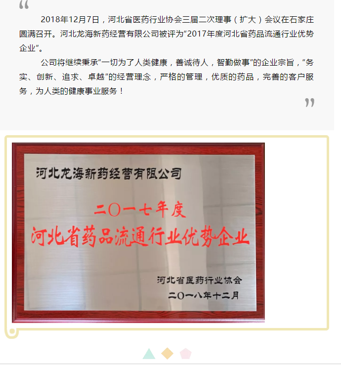 河北龙海荣获“2017年度河北省药品流通行业优势企业”